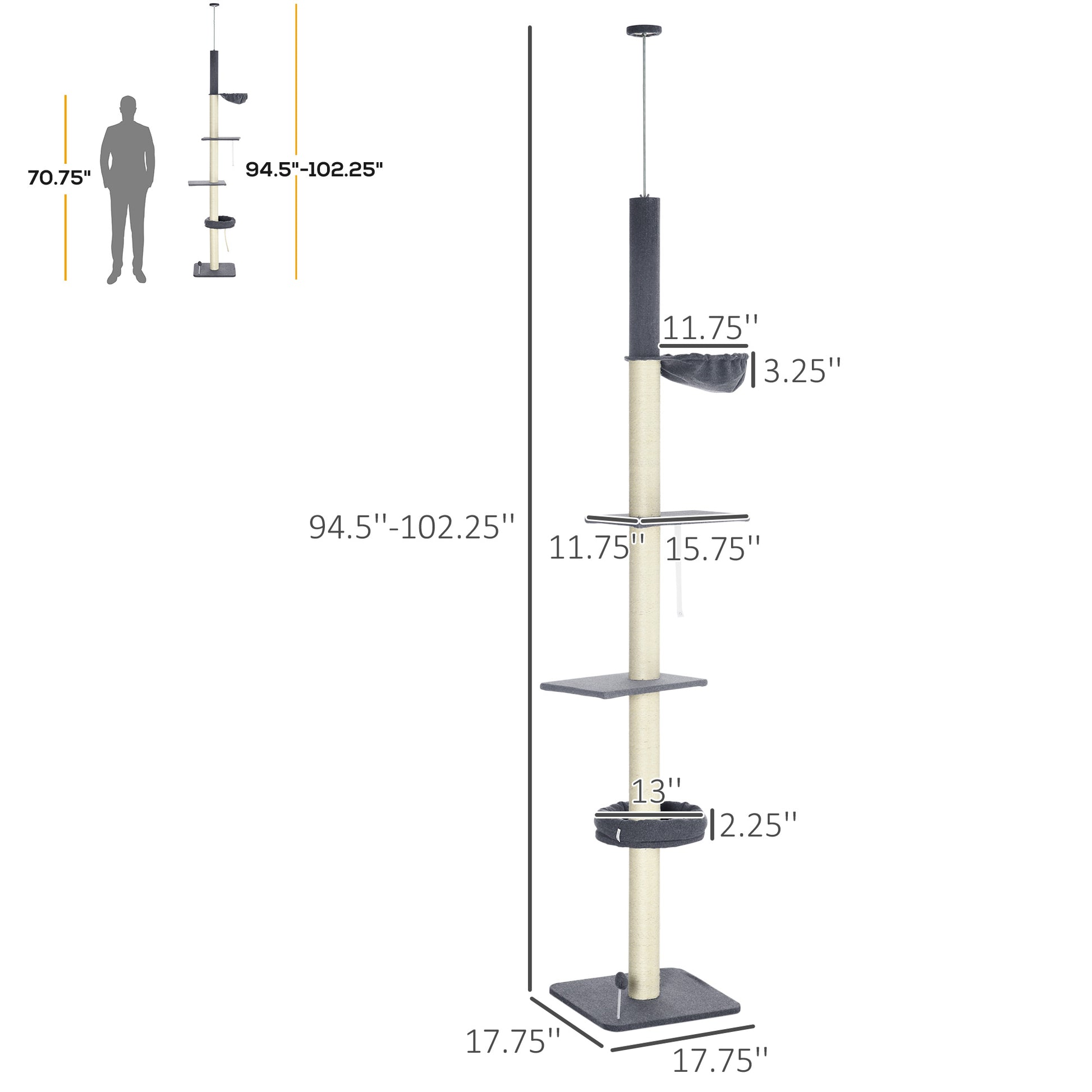 Cats are active; they do sufficient activities every day. They enjoy jumping, running, hiding, scratching, and lounging, which makes them healthy and happy. A towering and good-quality kitty tower is a place for cats to do those activities. It features scratching areas, offering them plenty of places to stretch and exercise their claws. Your little ones will have an absolute blast with this easy-to-install PawHut cat tree with multiple platforms!. Features: - 94.5" - 106.25'' adjustable height with an anti-topple strap offers your cats a great spot to survey the land (your home) around them - Multiple levels, satisfying your pet's urge to climb - Include sisal-wrapped posts so that cats can scratch and dig their claws - Spacious cat bed and hammock, providing extra comfort - Toy ball for fun – perfect for when they're feeling playful - Suitable for cats under 10lbs, assembly required Specification: - Color: Dark Gray and Cream - Material: Particleboard, Plush, Sisal - Overall Dimension: 17.75" L x 17.75" W x 94.5" -106.25" H - Bed Size: Φ13'' x 2.25'' H - Platform Size: 15.75'' L x 11.75'' W - Hammock Size: Φ11.75'' x 3.25'' H - Column Size: Φ3" - Recommend Pet Weight: under 10lbs - Item Label: D30-617V00BK Package Includes: -1 x Cat Tree -1 x Manual Create a pet haven that reaches the heavens with the Pawhut floor-to-ceiling cat tree. Its adjustable height ensures it fits your home. Cloud-shaped perches add a decorative touch. Platforms offer a retreat for your feline friend, satisfying their instinct to climb and offering cozy lounge spots. Playful puff balls provide solitary entertainment. Scratching posts allow for claw care, saving your furniture from harm, and a wall-mountable design offers you peace of mind as they play. Features: - Height ranges from 88.5" to 100.5" with the tension rod - Sisal posts satisfy your cat's instinct to scratch and deter them from damaging furniture - Multi-level design meets the desire to climb and explore - Includes anti-tipping device for safety - Plush fleece upholstery for comfort - Cloud-shaped perches add a unique touch - Balls for entertainment - Suitable for a cat under 10 lbs. - Assembly required Specification: - Color: White - Materials: Particle board, Teddy fleece, Sisal - Overall Dimensions: 19" W x 12.5" D x 88.5"-100.5" H - Perch Size: 15.75" W x 9.5" D - Base Size: 19" W x 12.5" D - Post Size: 3.25" Dia - Recommend Cat Weight: under 10 lbs. - Item Label: D30-716V00WT Package Includes: -1 x Cat Tree -1 x Manual Give kitty a pet haven with the PawHut floor-to-ceiling cat tree. The height can be changed – when the tension rod is compressed, it remains stable. With platforms at different levels, cats will enjoy climbing. It gives them several spaces covered in soft plush to lounge comfortably. Scratching posts satisfy their urge to dig and claw. Made from durable pine wood, it stays firmly upright. Topped with a toy ball, this cat tree keeps cats entertained. Features: - Adjustable height from 86.5" to 102.25" - An anti-slip kit included for safety - Sisal rope posts satisfy your cat's urge to scratch - Made from particle board for stability - Covered in soft and comfortable plush fabric - A toy ball for entertainment - Suitable for cats under 10 lbs. - Assembly required Specification: - Color: Yellow, White, and Blue - Materials: Particleboard, Plush Fabric and Sisal - Overall Size: 18.5" L x 13.5" W x 86.5" - 102.25" H. - Base Size: 18.5" L x 13.5" W - Perches Size: 15.75" L x 7.75" W - Post Size: 3.5" Dia - Recommended Cat Weight: Under 10 lbs. - Item label: D30-619V00YL Package Includes: - 1 x Cat Tree - 1 x Manual.